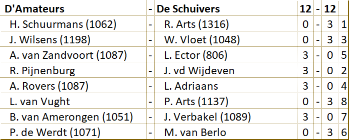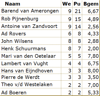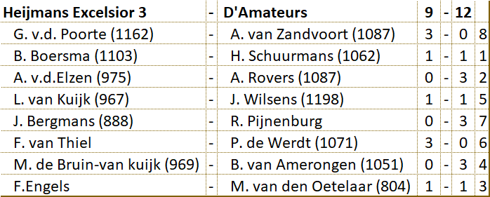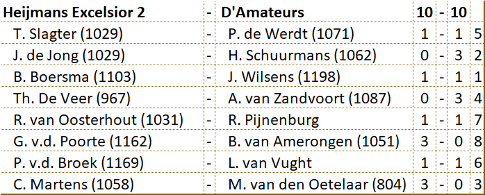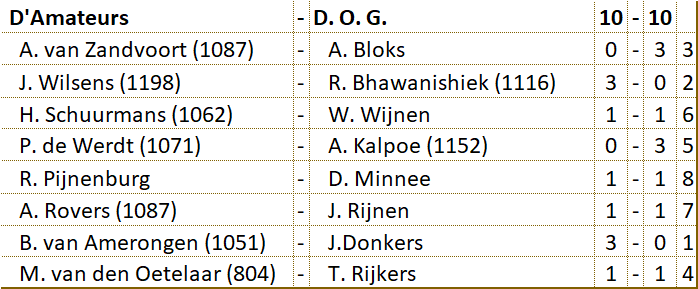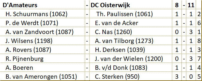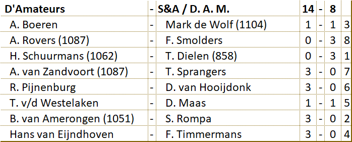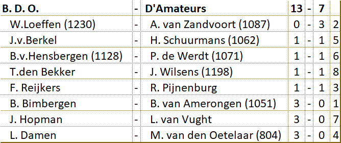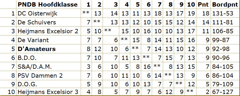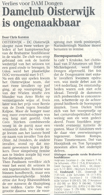D'Amateurs heeft onder de nieuwe coach Antoine een zwakke start gekend. Tegen BDO werd met maar liefst 13-7 verloren. Gelukkig werd daarna tegen DOG gelijkgespeeld. Er volgde een grote 15-6 nederlaag tegen De Variant. In de vierde ronde kwam D'Amateurs weer op gang. Tegen het sterke team van De Schuivers werd een gelijkspel geboekt. Daarna behaalde D'Amateurs zijn eerste zege. In Rosmalen werd HED 3 met 12-9 ingemaakt. Toen ook HED 2 met een gelijkspel werd bedwongen, kwam D'Amateurs uit het degradatiegevaar. Gijs v/d Poorte wist hier in de laatste partij van Barend te winnen en daardoor een nederlaag voor HED 2 te voorkomen. Tevens zette hij zijn score in twee wedstrijden (HED 2 en HED 3) op 6 punten. Daarmee bleef hij teamgenoot Boersma voor. Die kwam niet verder dan twee punten. Tegen DC Oisterwijk bracht D'Amateurs het tot een zeer acceptabele 8-11 nederlaag. Achteraf bleek dit de kleinste winst voor Oisterwijk. Aansluitend werd in Eindhoven een moeizame winst behaald op PSV Dammen 2. Hier was het Barend die er in de laatste partij in slaagde om de winst veilig te stellen. D'Amateurs kon niets meer gebeuren en speelde zeer ontspannen zijn laatste wedstrijd tegen S&A / D.A.M. uit Dongen. De duidelijke 14-8 overwinning leverde niet alleen drie punten op, maar was tevens oorzaak van een artikel in Het Brabants Dagblad. De kop "Hoempapamuziek" liet aan duidelijkheid niets te wensen over. D'Amateurs zal moeten pogen om dergelijke artikelen in de toekomst te voorkomen.