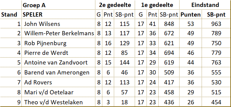 Eerste gedeelte competitie Zoals gebruikelijk speelde D'Amateurs zijn onderlinge competitie in twee gedeelten. Allereerst werd een enkele competitie gespeeld, waarin alle spelers het tegen elkaar opnamen. In de eindstand is zichtbaar dat John het eerste gedeelte met overmacht heeft gewonnen. Er is in twee groepen verder gestreden. |