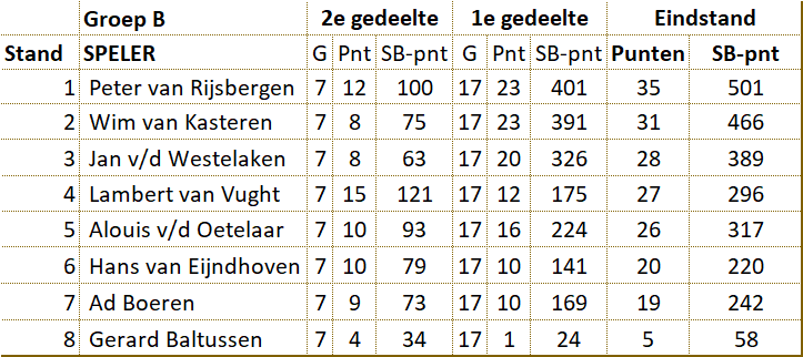 Peter kampioen B-poule van D’Amateurs In groep B heeft Peter van Rijsbergen door zijn overwinning het recht verworven op deelname aan de bondscompetitie in het eerste team van D'Amateurs.