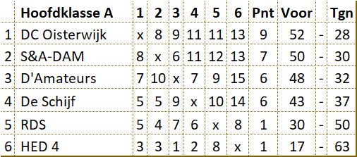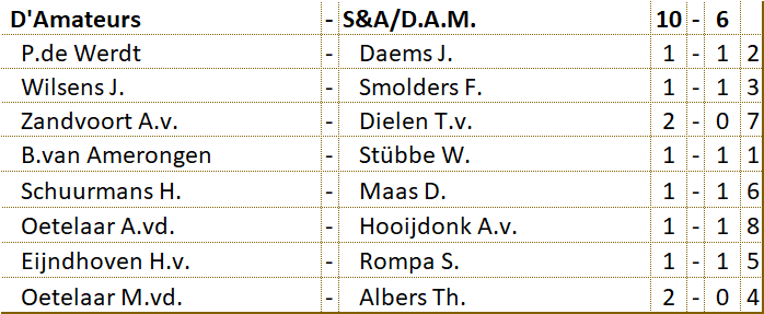Aan S&A-DAM werd meteen duidelijk gemaakt dat de winst op ons 2e team niet ongestraft kon blijven. Mari en Antoine legden met hun winstpartijen de basis voor een 10-6 overwinning. Opmerkelijk was dat D’Amateurs geen enkele verliespartij toestond. HED 4 trof het weer slecht met D’Amateurs. Alleen Henk gaf hun het enigste bordpunt. Tegen DC Oisterwijk werd een reeds ingeschat verlies geleden. De uitslag 7-9 gaf achteraf aan dat er mogelijk meer had ingezeten. Van RDS werd met veel moeite gewonnen. Zo werd de nederlaag uit het vorig seizoen weer rechtgezet. Van De Schijf werd nipt verloren. De overwinning van Rob kon de verliespartijen van Barend en Jan niet goedmaken. |