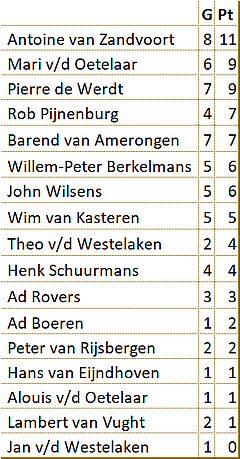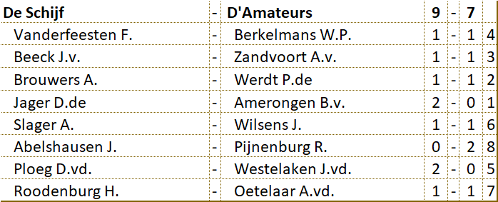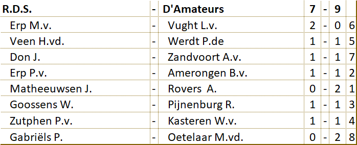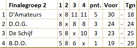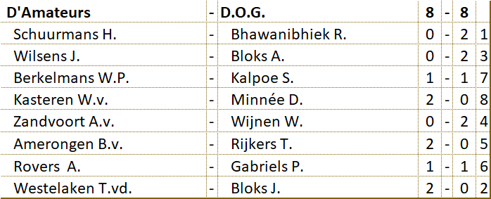 In finalegroep 2 werd tegen DOG een moeizaam gelijkspel afgedwongen. Tot de laatste partij keek D’Amateurs nog tegen een achterstand aan. De overwinning van Wim bracht de redding. De Schijf werd met een 11-5 nederlaag teruggezonden. De uitslag gaf een vertekend beeld vanwege het niet komen opdagen van drie tegenstanders. Duidelijk een gevolg van het ontbreken van draagvlak voor dit soort wedstrijden. Tegen BDO werd Wim opgeofferd. De overwinningen van Willem Peter, Theo en Ad Boeren maakten duidelijk dat Antoine een geboren strateeg is. |