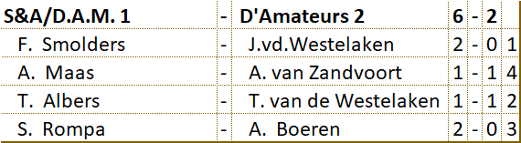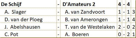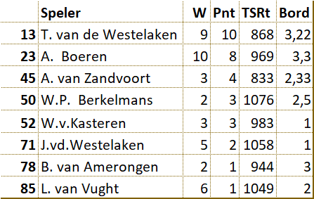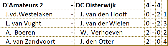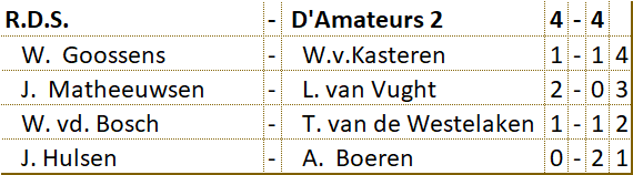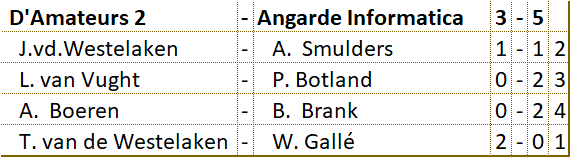 Het viertal heeft veel tegenstand ondervonden en is er niet in geslaagd om ook maar één wedstrijd winnend af te sluiten. Tot aan de laatste ronde bracht D’Amateurs het niet verder dan de onderste positie op de ranglijst. D’Amateurs heeft het hoofd echter niet laten hangen. Door de remise in de laatste ronde heeft het viertal de onderste plaats nog kunnen verlaten. De gemiddelde klassering van de spelers was een 52e plaats. |