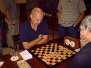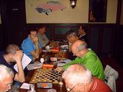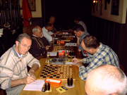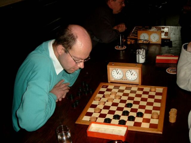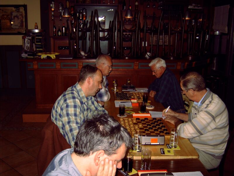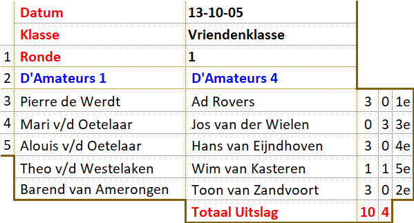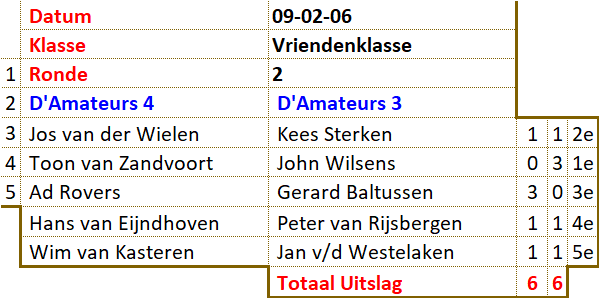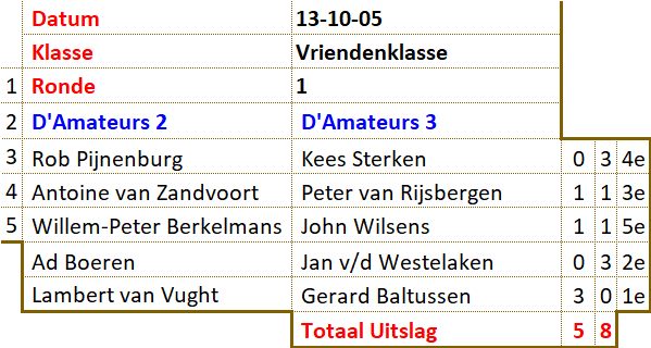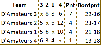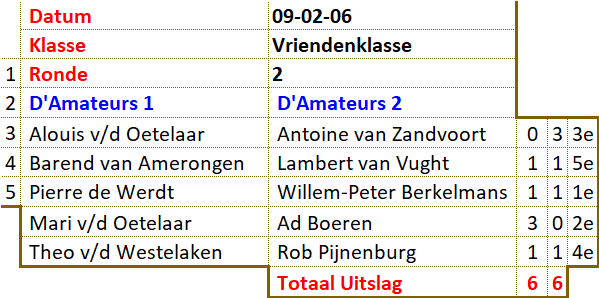 In grote afzondering heeft Barend zichzelf voorbereid op het treffen. Zijn teamleden misten elke vorm van leiderschap. Dankzij Pierre werd een grote nederlaag voorkomen. Toch duikelt het team van de eerste naar de derde plaats. Jos liet zijn team in de steek. Met een dammer minder en zonder sturing was het snel gedaan met D'Amateurs 4. Tegen het team van Antoine werd met grote cijfers verloren. Slechts Ad wist in zijn partij tegen Willem Peter de eer te redden. D'Amateurs 2 profiteerde volop en bereikte zelfs de tweede plaats. Het schijnbaar overmachtige team van Barend kwam 9 februari met de hakken over de sloot. Lange tijd leek het er op dat de captain in zijn partij tegen Lambert het hoofd zou moeten buigen. Als door een wonder wist hij de broodnodige remise nog te behalen. Met dit gelijkspel kreeg het team van Antoine eigenlijk minder dan verdiend. Ook het team van John moest zwaar aan de bak. Wat sterk hielp was de grootmeesterremise tussen Jos en Kees. Terwijl anderen dachten dat die partij net was begonnen, was voor hun de uitslag al duidelijk. Ook de captain liet hier zien wat hij waard was. Voor D'Amateurs betekende dit weer een uitbreiding van de bezienswaardigheden. Er zijn nog twee kanshebbers in de race voor het felbegeerde kampioenschap. Het team van John is aarzelend gestart met een bescheiden overwinning. Het team van Barend liep hard, maar komt nu al conditie tekort. |