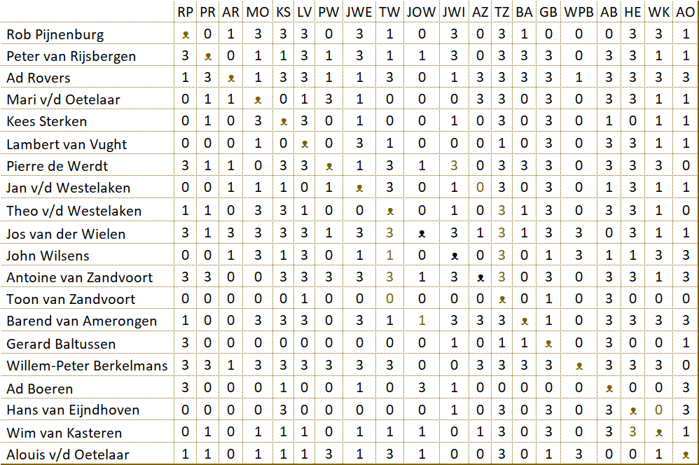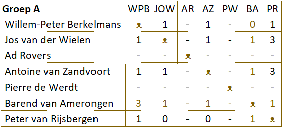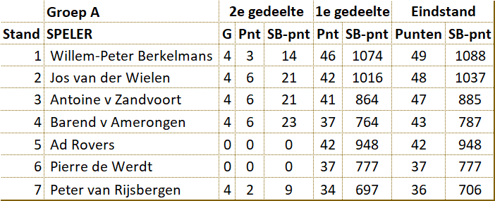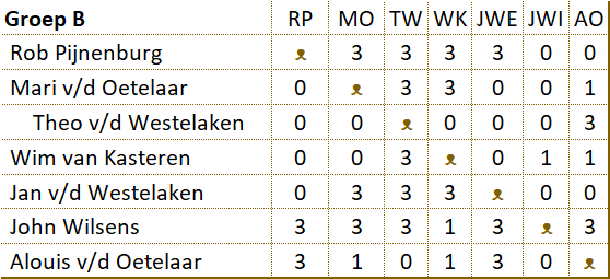De strijd in de B-poule In groep B heeft John toch nog verrassend aan het langste eind getrokken. Nadat Rob in enkele partijen punten liet liggen, was het voordeel voor John. In het rechtstreekse duel moest Rob winnen. Het werd een nederlaag, zodat de laatste wedstrijd van John geen belang meer had. Wim en John kwamen daarom remise overeen. |