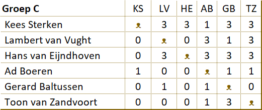 De strijd in de C-poule Ook in groep C bleef het spannend tot de laatste wedstrijd. Hans moest die winnen om zijn achterstand op Kees goed te maken. Kees trok echter aan het langste eind en eiste het kampioenschap op. |