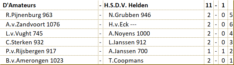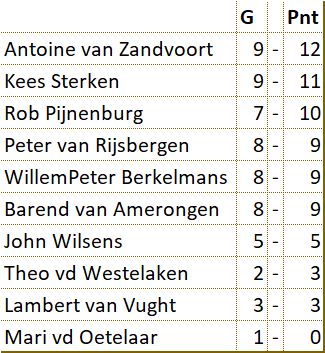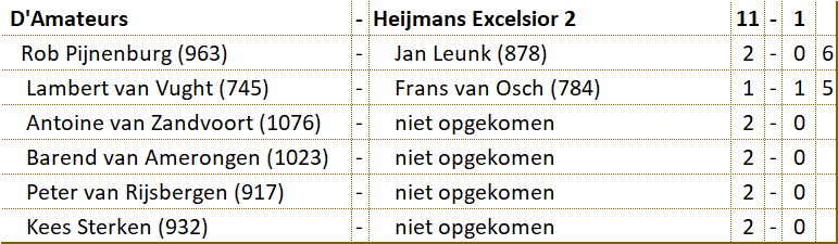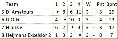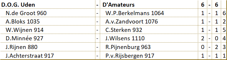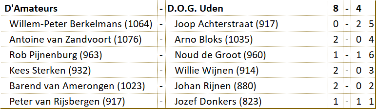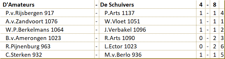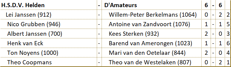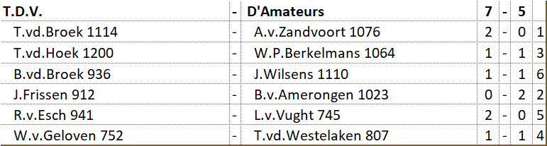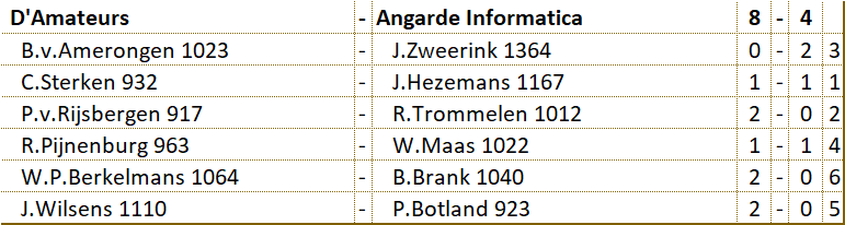 Het zestal van D'Amateurs heeft zijn succes niet kunnen vasthouden. Willem-Peter speelde boven verwachting, maar de teamleider liet het liggen. Dat verlies werd nog goedgemaakt door de winstpartij van Barend. John en Theo slaagden er echter niet in om het verlies van Lambert te compenseren. |