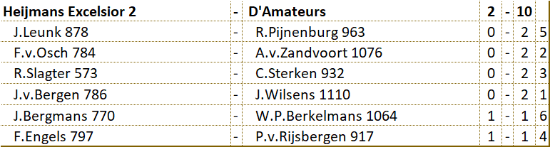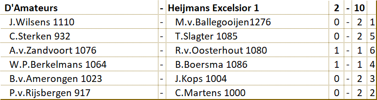 Ons zestal heeft zich weer goed hersteld. Tegen Heijmans Excelsior 2 liep het van een leien dakje. Gezien de ratingverschillen mocht dit ook worden verwacht. De prestatie van J.Bergmans tegen Willem Peter is daarom bijzonder goed te noemen. |