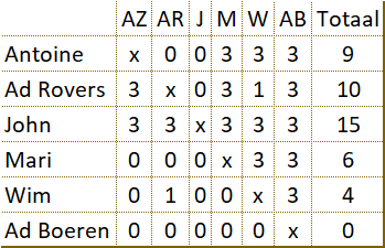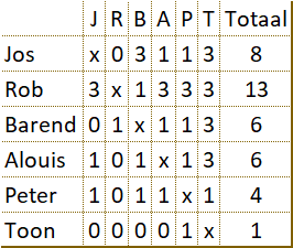 Jos van der Wielen is 'sneldammer van de dag'! Op 25 juni hebben 12 dammers een vriendschappelijk sneldamtoernooi gespeeld. Er is gestart met twee ongeveer gelijkwaardige groepen. Daarna volgden in een halve finale 'kruispartijen' waarin de nummer 1 van een groep tegen de nummer 2 van de andere groep moest spelen. (en 3 tegen 4 en ook 5 tegen 6) Tot slot (op volgorde) steeds de twee winnaars tegen elkaar voor de plaatsen 1 t/m 12. Jos wist in die finale Rob te verslaan en is de 'sneldammer van de dag' geworden. |