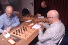 Onze nieuwe competitieleider vond het geen goed idee dat Barend zonder te spelen zou overgaan naar de volgende ronde. Dus hij bedacht iets anders. Barend zou samen met de remisespelers Willem-Peter en John moeten uitmaken wie er door mocht. Niet met sneldampartijen, maar met reguliere partijen die gelijktijdig warden gespeeld. Er warden drie borden opgesteld, waarbij elke speller twee partijen gelijktijdig moest afhandelen. Voor D’Amateurs een unieke gebeurtenis. John won zijn partij tegen Barend en leek op weg naar zijn zoveelste titel. Willem-Peter had het moeilijk omdat hij nog tegen twee tegenstanders tegelijk moest spelen. Toch trok hij aan het langste eind. John zag een combinative over de kop en Barend kwam net tekort om zijn partij tegen Willem-Peter te winnen. |