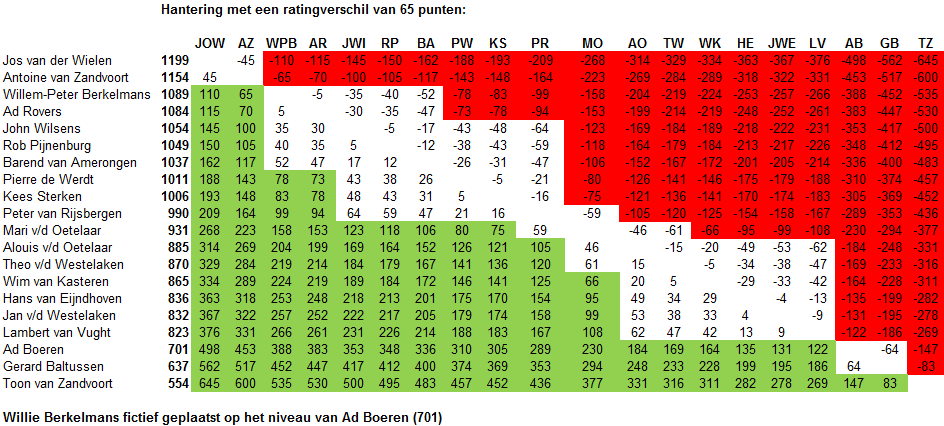 De gehanteerde regeling om voordeel en nadeel te laten bepalen door de rating zet regelmatig de hoger geklasseerde spelers extra onder druk. Een rood gemarkeerde speler moet de partij winnen om de volgende ronde te behalen. Hieronder is te zien met welke onderlinge rating voor- en nadeel is bepaald.