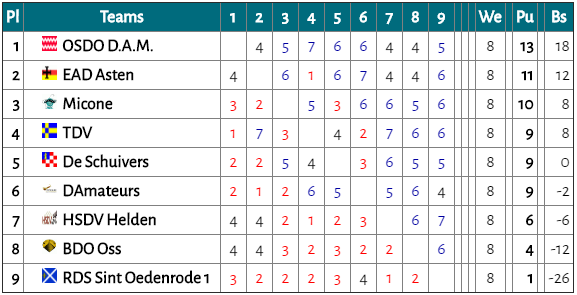 Door het verlies tegen E.A.D. is D’Amateurs terug gezakt naar de derde plaats. In de laatste wedstrijd zal het team deze plaats tegen Micone moeten verdedigen. Er is dan minder uitgekomen dan werd gehoopt voordat het seizoen begon. Toch zal een derde plaats voor het team van Theo als acceptabel worden gezien.