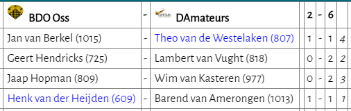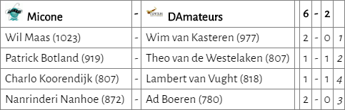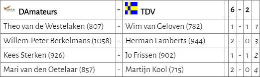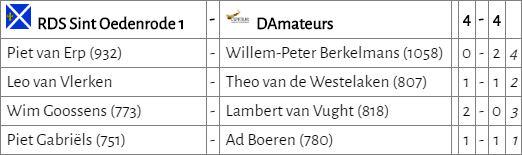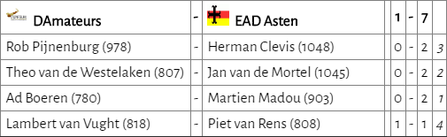 D’Amateurs lijkt van slag. Ad en Theo speelden remise, maar door het verlies van Lambert moest Willem-Peter winnen om de stand gelijk te houden. De uitgangspositie op een goede klassering wordt daarmee echter steeds slechter.