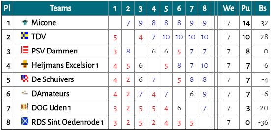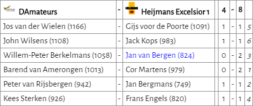Ons zestal moest meteen aantreden tegen de kampioenskandidaat en dat hebben ze geweten. Toch is de stand enigszins geflatteerd. Jos kwam een schijf voor en had die terug kunnen offeren, zodat hij minimaal remise zou spelen. Ook Kees had meer van zijn patij verwacht. Gelukkig hebben Antoine en invaller Theo nog enkele punten behaald, zodat de eer gered werd.