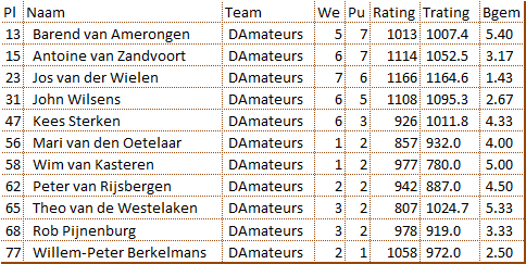 D'Amateurs speelt met een zestal in de hoofdklasse van de provinciale dambond. Dit zestal werd steeds samengesteld uit meerdere spelers. Beoogd werd dat de spelers die graag bondswedstrijden willen spelen daar de gelegenheid voor krijgen. Maar ook dat het onderlinge programma van D'Amateurs niet in het gedrang komt. De strijd in de hoofdklasse bleek erg hevig te zijn. Drie tegenstanders waren een klasse beter dan ons team. Barend en Antoine behaalden 7 punten waarmee Barend het beste resultaat neerzette omdat hij dit met een wedstrijd minder voor elkaar kreeg