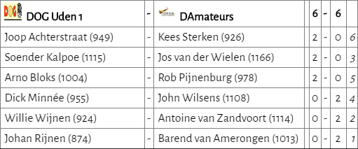 Al doet de uitslag anders vermoeden; het heeft er gespannen in Uden. Niet één partij eindigde in remise. Toch is het behaalde gelijkspel voor D’Amateurs enigszins teleurstellend. Zeker als je bekijkt dat we met 4-0 voor kwamen en de overblijvende tegenstanders gemiddeld genomen als gelijkwaardig gezien mochten worden, maar niet als beduidend beter. Bovendien zette ook John zijn op papier betere kwaliteiten om in winst. Maar D.O.G. behaalde uit de overige partijen de maximale score en wist daarmee en verlies te voorkomen.