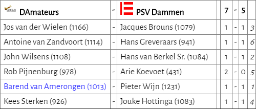 D’Amateurs boekte een nipte overwinning. Terwijl D’Amateurs aan de bovenste drie borden het papieren voordeel niet konden waarmaken, lukte dat voor P.S.V. Dammen niet op de onderste borden. Rob behaalde met zijn overwinning de buit voor D’Amateurs binnen. Deze wedstrijd zal altijd overschaduwd blijven doordat de heer Koevoet enkele dagen na deze wedstrijd plotseling is overleden.