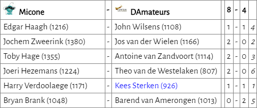 Het leek een beetje op een wedstrijd tussen de reus en Klein Duimpje. D’Amateurs moest het opboksen tegen een team waarvan de gemiddelde rating maar liefst 210 punten hoger lag. De uitslag was dan ook niet verrassend. John en Kees behaalden een verdienstelijke remise. Barend wist zijn partij zelfs te winnen. Maar Micone ging zeer verdiend met de eer en het kampioenschap strijken.