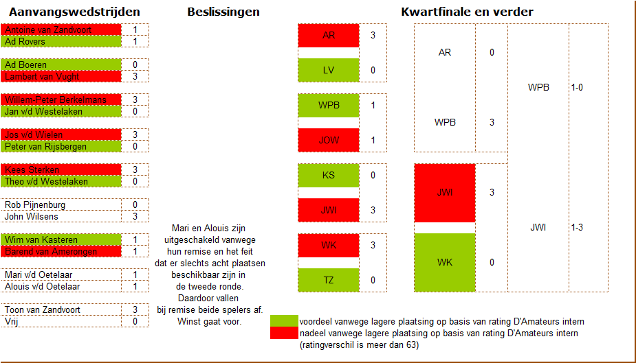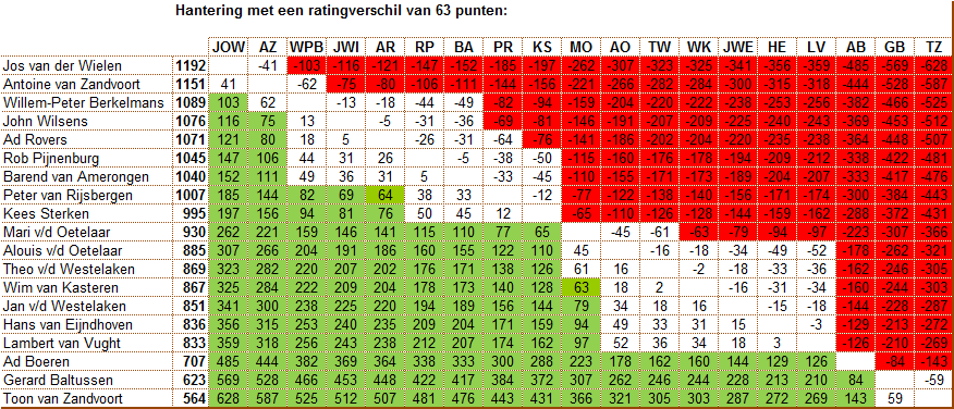 De gehanteerde regeling om voordeel en nadeel te laten bepalen door de rating zet regelmatig de hoger geklasseerde spelers extra onder druk. Ze bleken daartegen niet altijd opgewassen. Hieronder is te zien met welke onderlinge rating voor- en nadeel is bepaald.