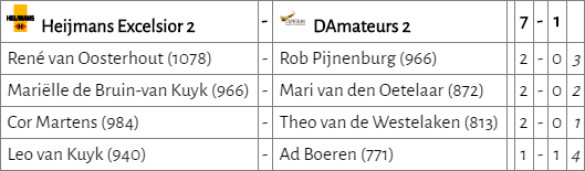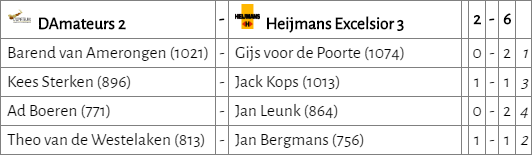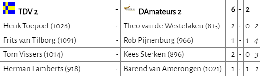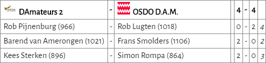 D’Amateurs 2 leek zijn eerste winst te kunnen pakken. Na het verlies van teamleider Theo trokken Barend en Kees de stand in ons voordeel. Het leek erop dat Rob gelijk kon spelen. Echter, in hevige tijdnood wist hij de remisevariant niet te vinden. Mede doordat tegenstander Rob Lugten het eindspel ijzersterk afhandelde. Beide teams kregen daardoor een puntje.