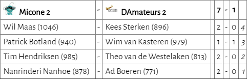 Micone was duidelijk te sterk voor D’Amateurs. Wim kwam al snel een schijf achter en mogelijk was dat zijn redding. De tegenstander speelde erg snel en gaf Wim de kans om nog remise te maken en de eer voor D’Amateurs veilig te stellen.