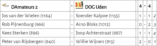 Het team van D’Amateurs heeft mogelijk een dienst verleend aan het team van HED. Koploper DOG uit Uden werd op een gelijkspel gehouden. Peter gaf het goede voorbeeld door zijn tegenstander te verslaan. Jos behaalde remise. Daarna gooide Rob roet in het eten. Hij maakte een fout waardoor zijn remiseachtige stand meteen was verloren. Kees moest alles op alles zetten om zijn partij in remise te laten eindigen. Maar hij maakte geen fouten, zodat D’Amateurs de laatste plaats van de ranglijst weer heeft verlaten.