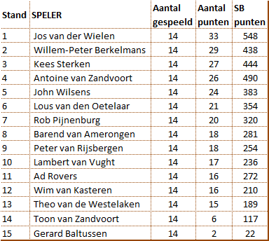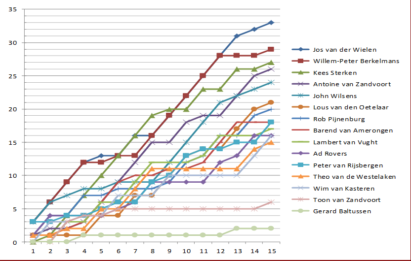 Vanaf het begin ontstond er een kopgroep die er geen twijfel over liet bestaan over hun plannen. Willem-Peter en Jos wonnen beiden hun eerste vier partijen. In ronde 5 en 6 waren beiden een ronde vrij en speelden remise in de andere partij. Kees kwam langszij alhoewel hij één partij meer had gespeeld. In ronde 7 werd Willem-Peter gepasseerd vanwege zijn verlies tegen Antoine. Kees speelde alles uit de kast en won in ronde 8 van Jos. Toch bleven deze drie spelers de ranglijst aanvoeren. De overige spelers waren niet bij machte om dit tempo bij te benen. Door zijn remise in ronde 9 en het vrij zijn in ronde 10 moest Kees afhaken. Willem-Peter en Jos vormden gezamenlijk met 22 punten uit 9 wedstrijden de kop van het klassement. Kees volgde op 2 punten. Nadat Kees in ronde 12 het onderspit moest delven tegen Barend was het voor hem gedaan. Een kampioenschap zat er voor hem niet meer in.