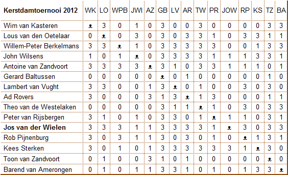 D’Amateurs heeft op 27 december 2012 haar jaarlijkse Kerstdamtoernooi gehouden. De deelnemers hebben dit weer als een plezierige dag ervaren. Er is flink strijd geleverd. Er was voldoende ruimte voor gezellige onderonsjes. Door De Huif werd de inwendige mens prima verzorgd. Greet v/d Westelaken en Bernadet Rovers zorgden als vanouds weer voor de beschikbaarheid van passende prijzen.