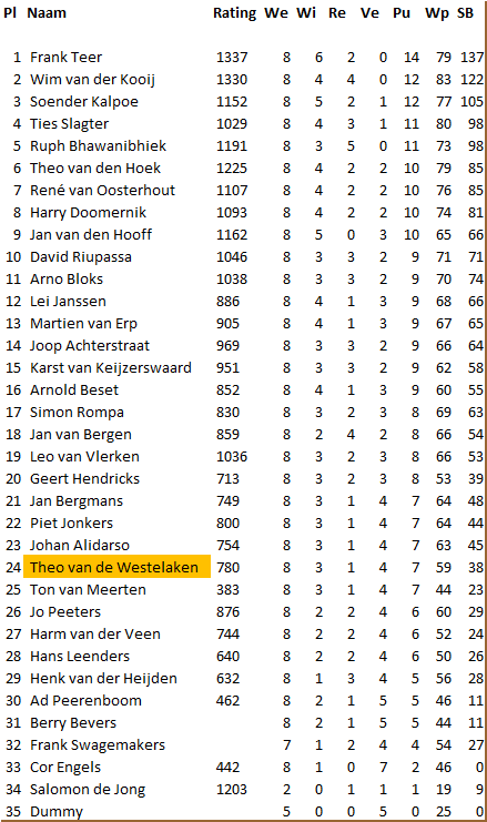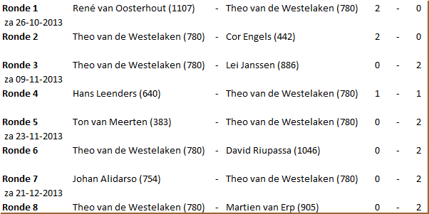 Dit seizoen nam Theo van de Westelaken weer deel aan de persoonlijke provinciale kampioenschappen. Tijdens dit kampioenschap wordt door alle deelnemers in een Zwitsers systeem gespeeld. Na afloop wordt bepaald welke speler per klasse het kampioenschap heeft behaald. In de eerste ronde was de tegenstand voor Theo te groot. Maar in de tweede ronde behaalde Theo zijn eerste wedstrijdpunten. De derde ronde ging voor Theo verloren, maar in de vierde ronde pakte hij weer een punt. Ronde vijf leverde weer twee punten op maar in ronde zes boekte Theo een verliespartij waardoor hij in de klassering zakte naar de 26e plaats. Met twee punten in de laatste twee ronden heeft Theo zich uiteindelijk weer naar de 24e plaats gespeeld. In totaal behaalde hij 7 punten uit 8 wedstrijden. De gemiddelde rating van zijn tegenstanders was nagenoeg gelijk aan die van Theo zelf. Proficiat met dit resultaat.