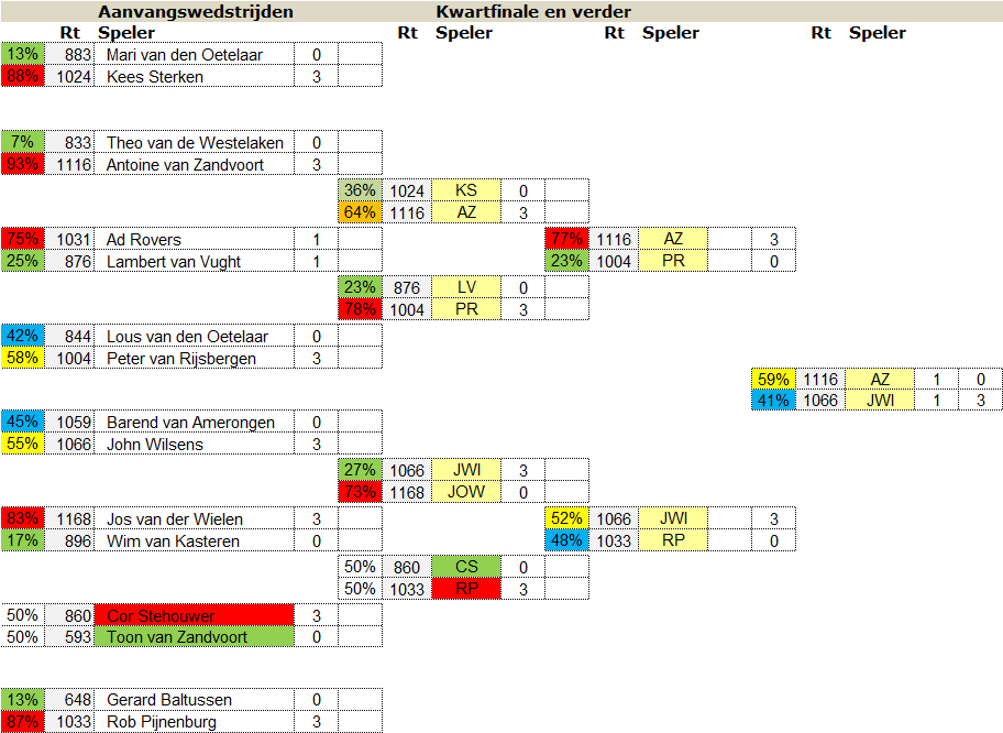 John zorgde voor een verrassing door clubkampioen Jos uit te schakelen. In een magistrale partij moest Jos het onderspit delven. Antoine is de vierde halve finalist Met een zesklapper maakte hij een eind aan zijn partij tegen Kees.
