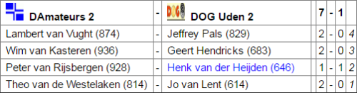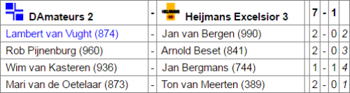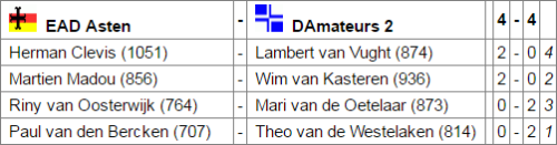 D'Amateurs speelde met een viertal in de Eerste klasse van de provinciale dambond. Dit viertal werd steeds samengesteld uit meerdere spelers. Beoogd werd dat de spelers die graag bondswedstrijden willen spelen daar de gelegenheid voor krijgen. Maar ook dat het onderlinge programma van D'Amateurs niet in het gedrang komt. Ons team eindigde op een verdienstelijke derde plaats.