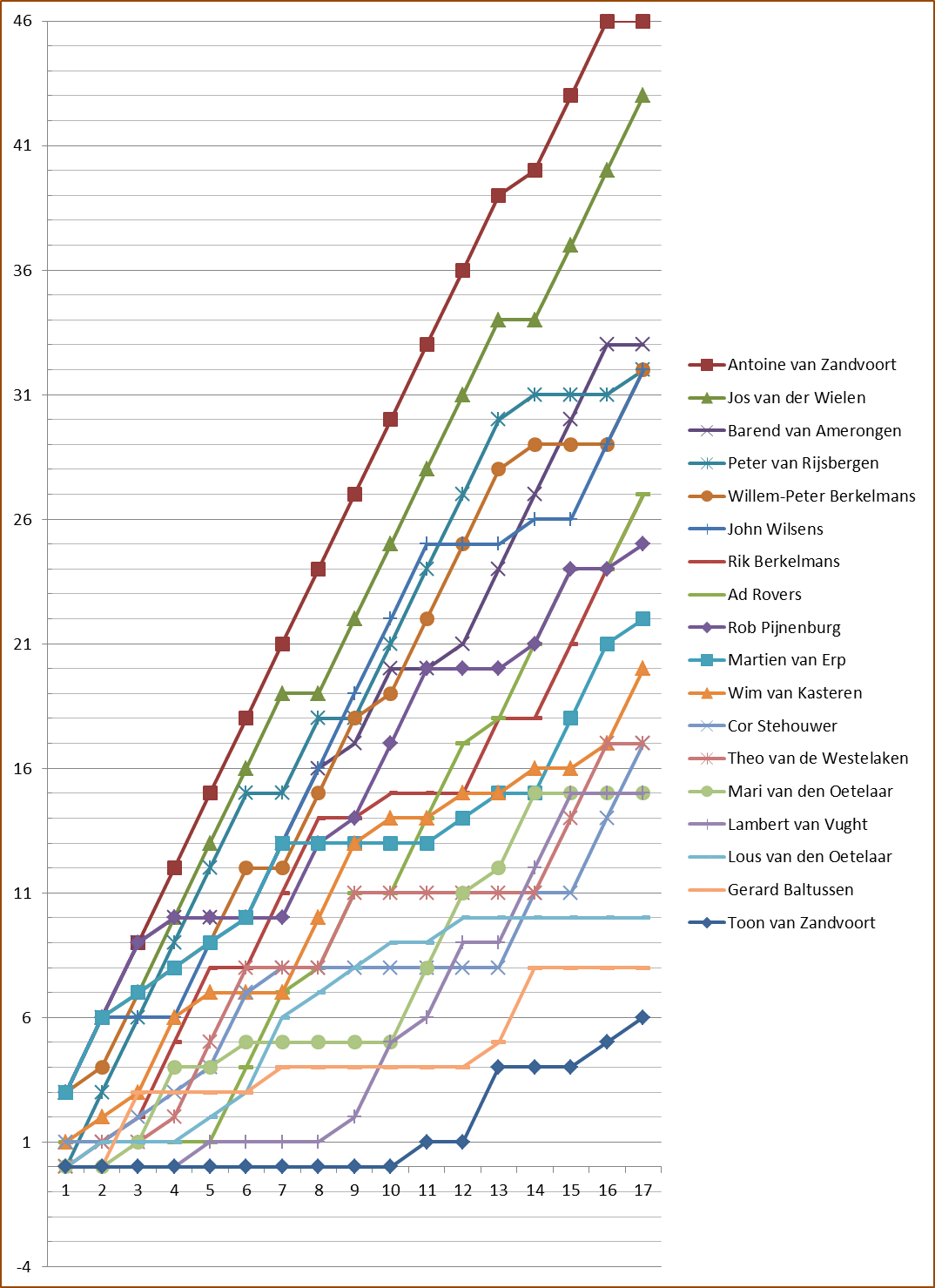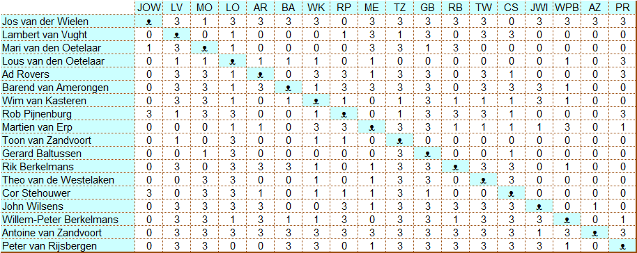 De vertoonde grafiek geeft duidelijk het oppermachtige spelen van Antoine aan, die op de voet werd gevolgd door Jos.