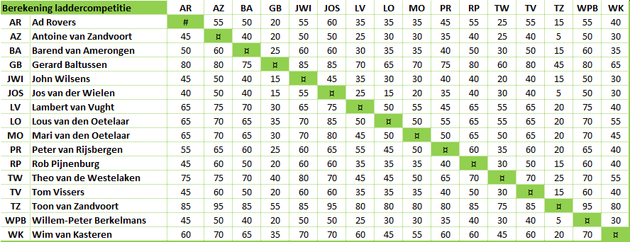 In het overzicht hieronder kan je zien hoeveel punten er tussen twee spelers zijn te verdienen. Bij winst geldt het dubbele aantal punten.