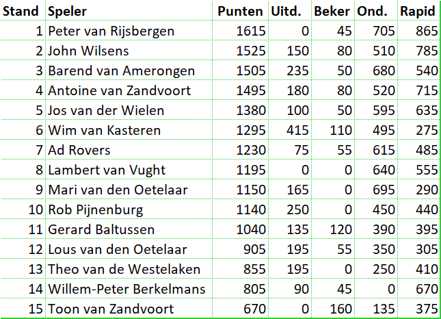 Een nieuwe koploper. Cor is gestopt en heeft in alle competities minder dan de helft van de partijen gespeeld. Daardoor komen de tegen hem behaalde punten te vervallen. Mari zakt hierdoor op de ranglijst. Barend won van Wim die daarmee de koppositie is kwijtgeraakt. Met zijn winst op Rob is Peter de nieuwe koploper. Hij wordt op de hielen gezeten door Barend en Wim.