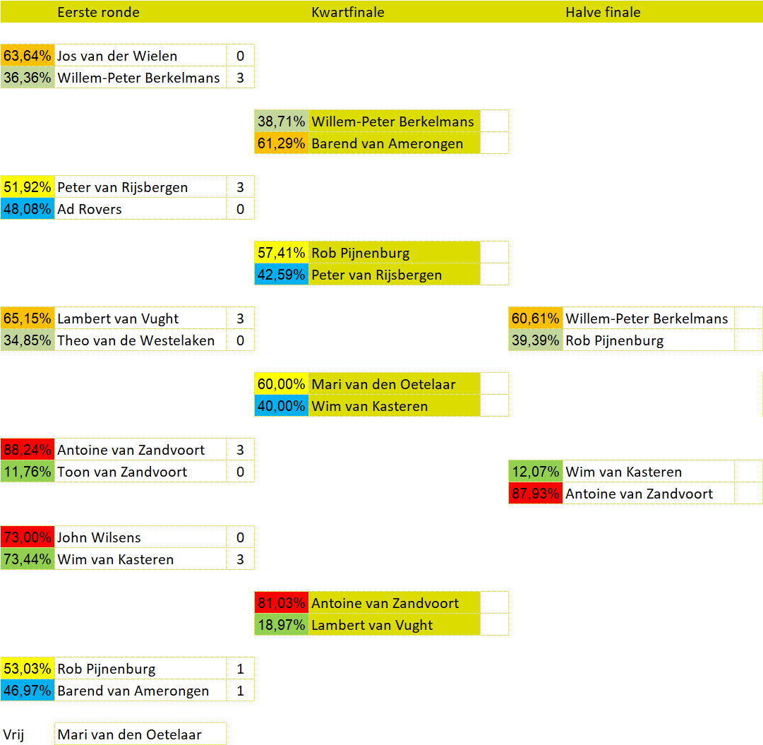 Van de vier gespeelde partijen eindigde er slechts één in remise. Barend en Willem-Peter namen beiden weinig risico met de overtuiging dat de sneldampartij in hun voordeel zou uitvallen. In die sneldampartij trok Barend aan het kortste eind zodat Willem-Peter naar de halve finale gaat. Daar mag hij het opnemen tegen Rob die wél risico nam in zijn partij tegen Peter. De laatste stond volgens de omstanders beter maar miste de goede voortzetting in het eindspel. Winst was er ook voor Antoine die Lambert versloeg. De partij tussen Mari en Wim werd weer een partij waarin beide spelers risico namen. Wim kreeg voordeel dat hij weer inleverde. Mari maakte daarvan geen gebruik. Hij speelde niet op zijn sterkst en liep weer nadeel op. In het eindspel zag hij een meerslagvariant over de kop waarna Wim het uitmaakte. Hij mag het tegen Antoine gaan opnemen in de halve finale.