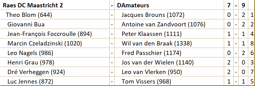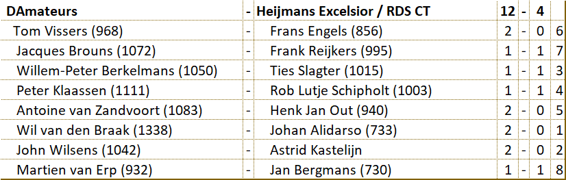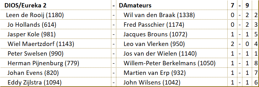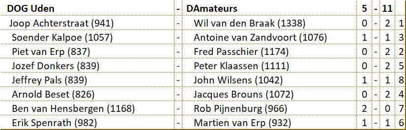 Wellicht hebben de spelers van D'Amateurs hun tegenstanders oderschat. Het varkentje zou wel even gewassen worden. Niets bleek minder waar. Na het verlies van Leo moest Wil zelfs alle zeilen bijzetten om met een schijf achterstand toch de teamoverwinning binnen te halen. Dat voorkwam dat D'Amateurs met de staart tussen de benen moest afdruipen. Laten we hopen dat deze benauwde overwinning de motivatie brengt om de overige wedstrijden met een goed gevolg af te ronden. Succes mannen! |