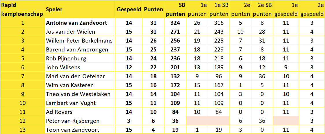 Er werden weer drie ronden voor de Rapidcompetitie gespeeld. De prestaties waren erg wisselend. Wat te denken van Toon, die Willem-Peter op remise wist te houden? En van Jos die een lokzet wilde uitvoeren tegen Wim maar zelf in zijn kuil duikelde? Of van de overwinning van Lambert op John, die op zijn beurt een ronde eerder van Jos had gewonnen? Ex-koploper Jos had met een score van slechts één punt de slechtste avond. Hij duikelde van de eerste naar de derde plaats op de ranglijst. Rob werd met drie overwinningen de grote winnaar van de avond. Hij had het geluk aan zijn zijde. Wim maakte een fou die hem een schijf kostte. Willem-Peter speelde te lang op de winst en ging daardoor zelf de mist in. En Ad miste in het eindspel de remisevariant. Toch heeft Rob met zijn degelijke spel zeer verdiend de behaalde scores afgedwongen. Hij maakt een sprong van zes plaatsen binnen de ranglijst. Antoine behaalde zeven punten wat genoeg bleek om de koppositie in te nemen. We hebben ook een speler die onze voorzitter van de troon wil stoten. Niet op functie, maar op aantal remisepartijen. Barend is zo verdiept in zijn verdedigende spel dat hij blijkbaar te weinig risico's neemt. En juist daarmee worden binnen D'Amateurs de meeste punten behaald. Zowel positief als negatief. Binnen onze club wordt bewezen dat dammen geen kwestie is van simpel remise spelen. Het percentage winstpartijen ligt beduidend hoger dan bij het wereldkampioenschap. Zelfs daar kunnen ze dus van D'Amateurs nog iets leren.