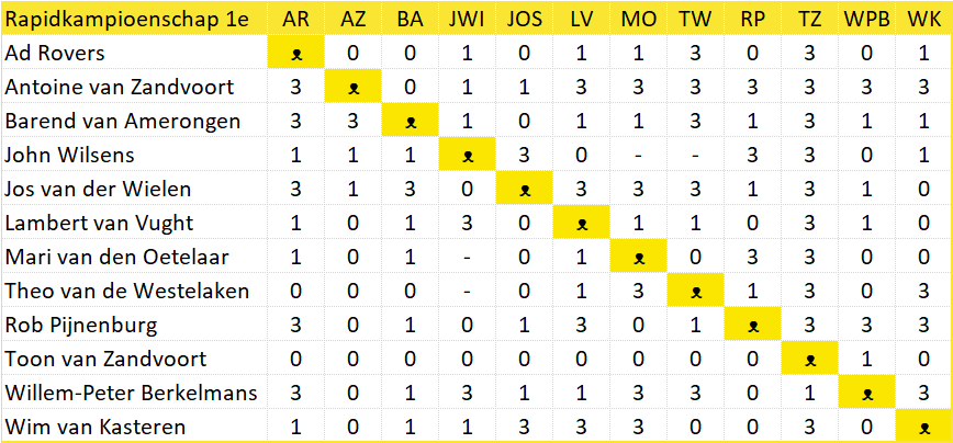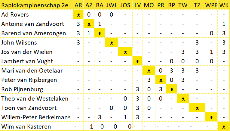 Er werden weer drie ronden gespeeld en de verrassingen waren niet van de lucht. Barend en Wim spanden de kroon door in één partij maar liefst vier blunders op te nemen. Die waren goed verdeeld zodat de remise een bij de partij behorende uitslag werd. Met zijn winstpartijen tegen Ad en Toon deed Barend verder goede zaken. Jos won alle drie partijen. Dat bleek voldoende om hem de nieuwe koploper te laten zijn. Met zijn twee overwinningen en een remise deed Antoine het ook niet slecht. Hij volgt op 1 punt. Willem-Peter verloor van Antoine maar won van John. De grootste verrassing was echter zijn remise tegen Lambert. Een partij waarin Lambert voor de afwisseling meer tijd in het eindspel had dan zijn tegenstander. Met dit resultaat zakte Willem-Peter een plaats op de ranglijst. Met zijn overwinning op Mari en de remise tegen Rob bleek Theo een geduchte tegenstander. In de partij tegen Rob zat er zelfs nog meer in.