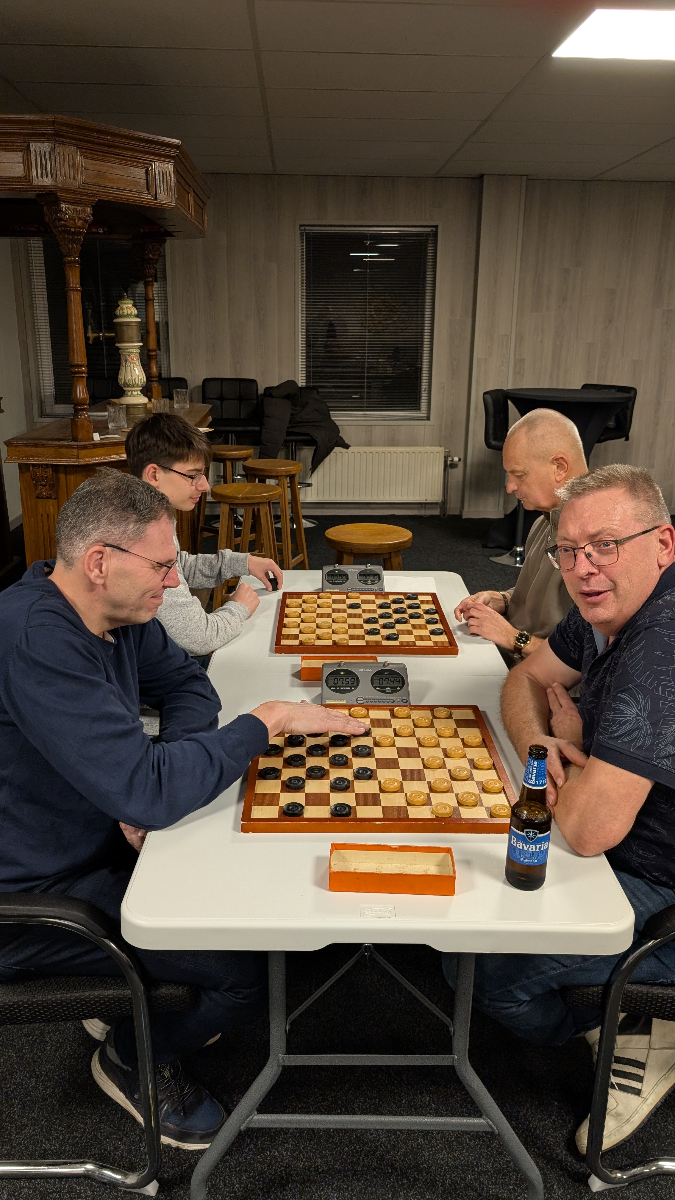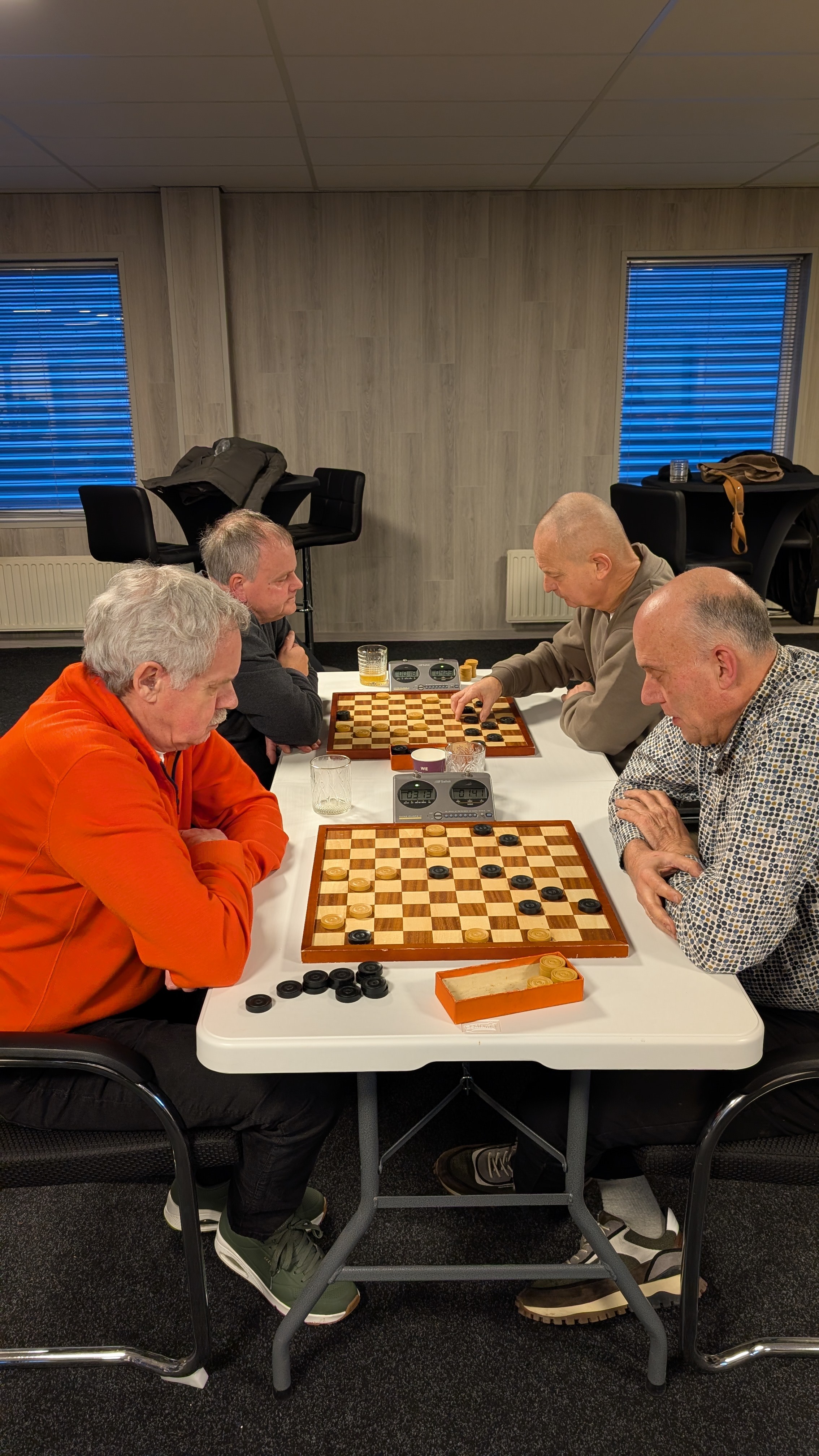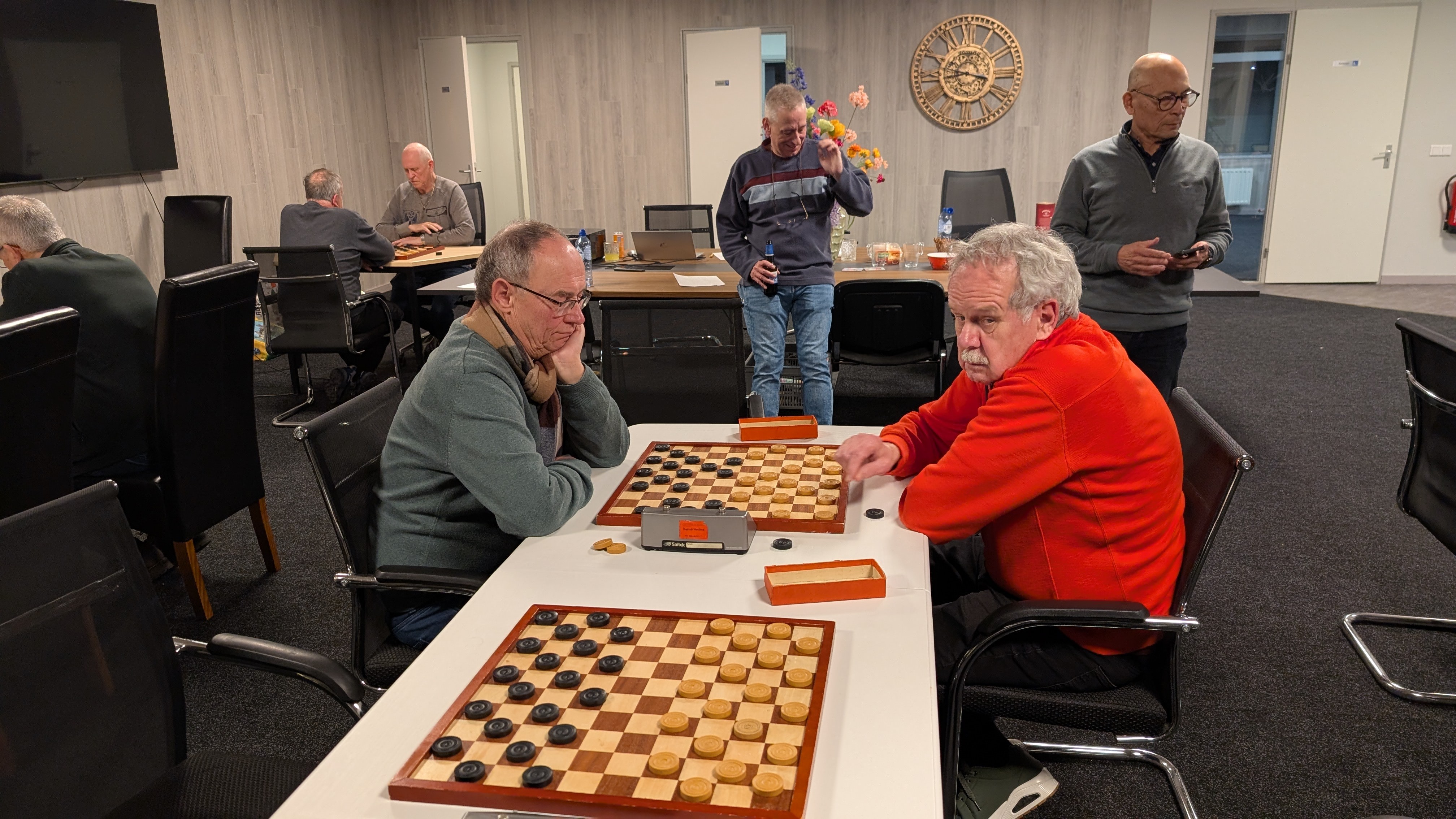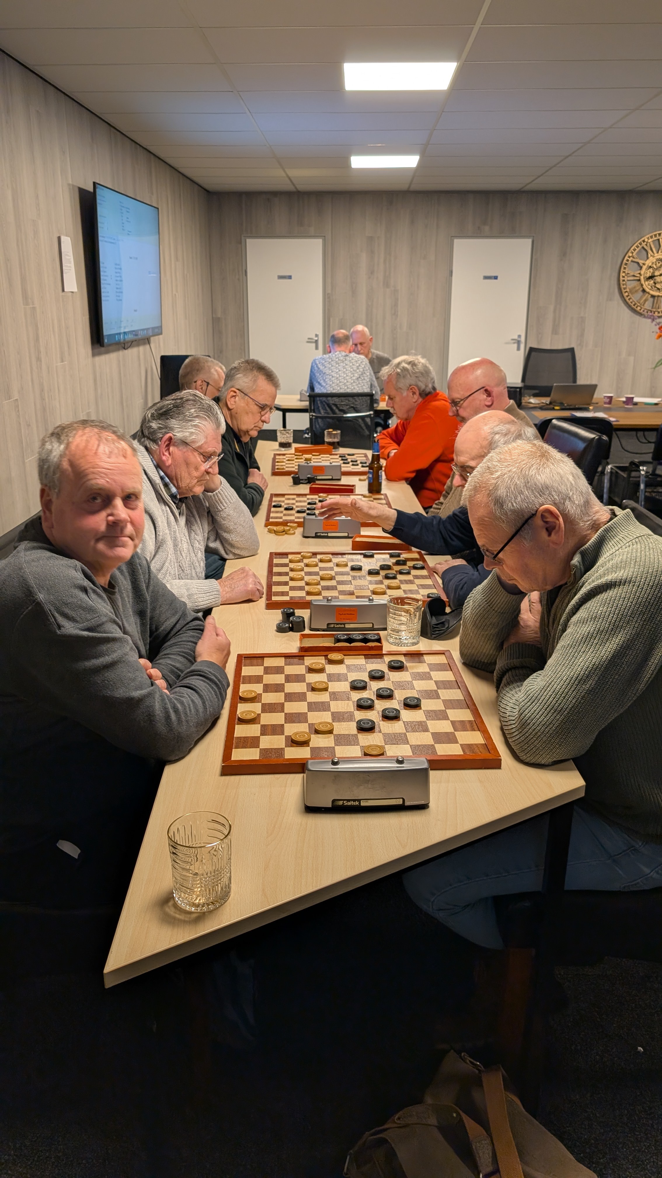 Er werd gespeeld met een tempo van 8 minuten en 5 seconden per zet. Dat was voor enkele deelnemers een verademing terwijl de profs vonden dat het een slakkegangetje betrof. Het plezier was er niet minder om. Vooraf werd nog eens benadrukt dat het belangrijkste uitgangspunt is dat sportiviteit en gezelligheid voorop staan. Dat het niet doorspelen nadat de klok gevallen is daar ook onder valt was voor bijna iedereen duidelijk.