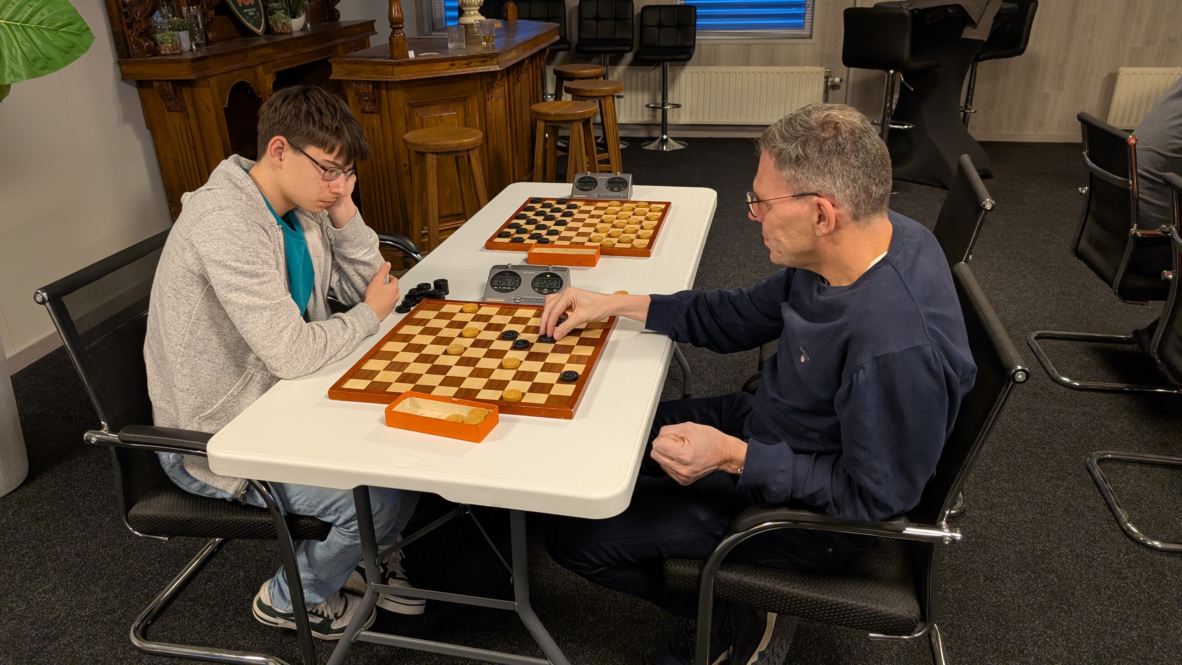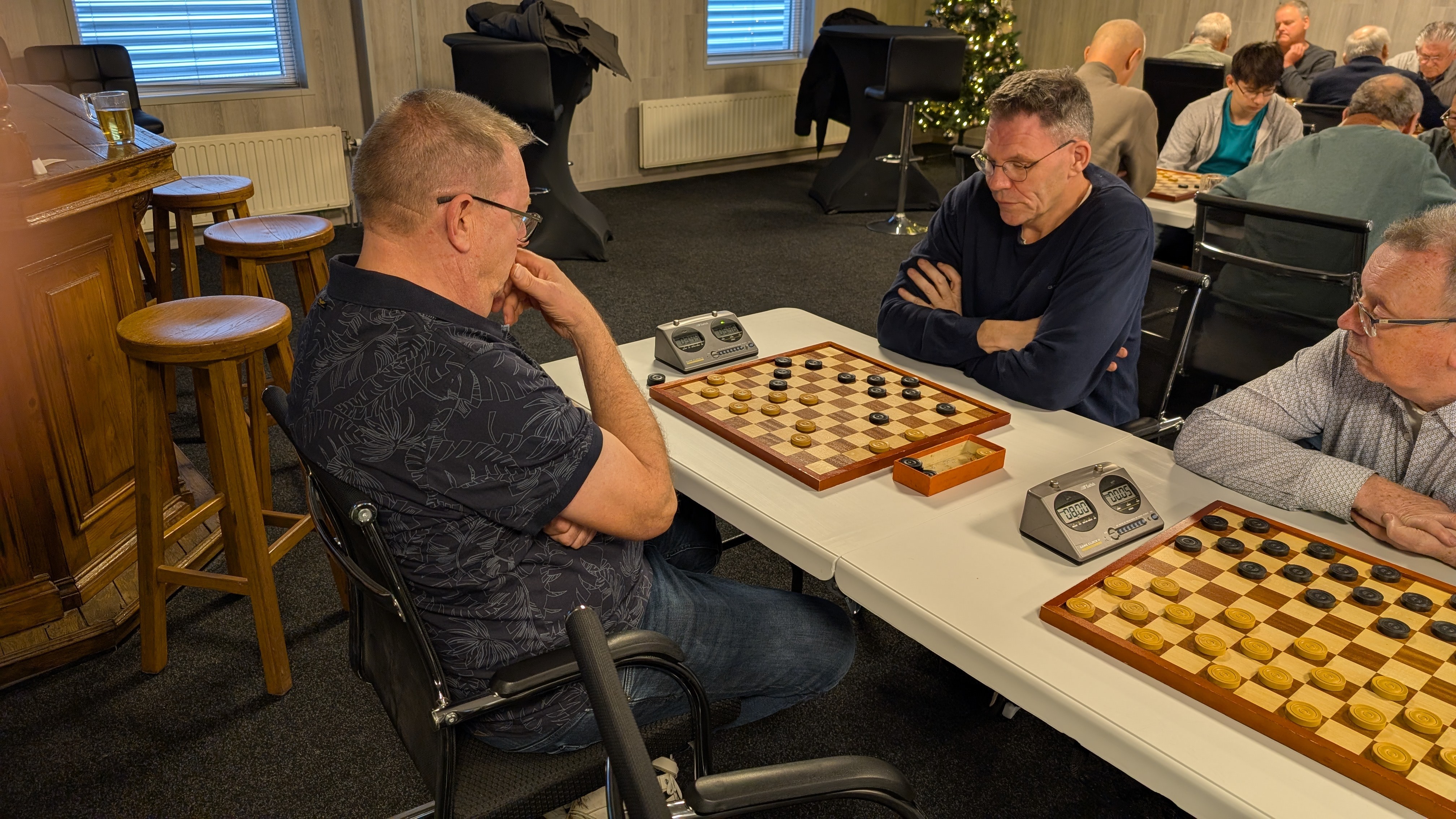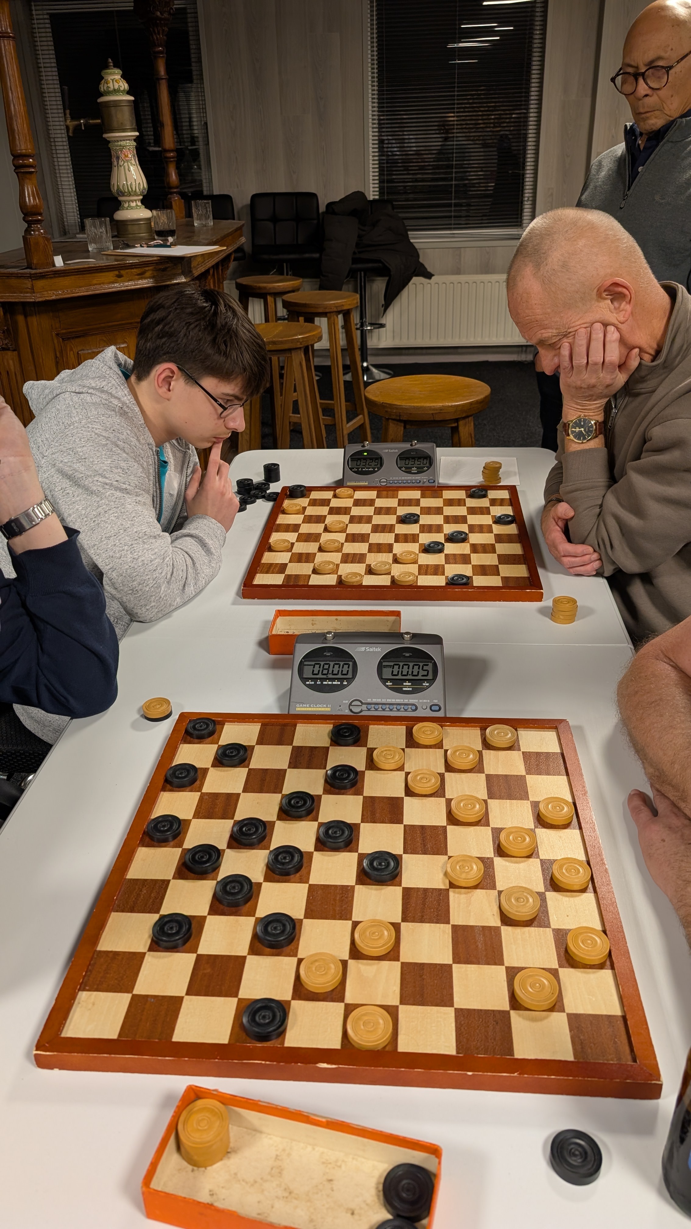 Er werd gespeeld met een tempo van 8 minuten en 5 seconden per zet. Dat was voor enkele deelnemers een verademing terwijl de profs vonden dat het een slakkegangetje betrof. Het plezier was er niet minder om. Vooraf werd nog eens benadrukt dat het belangrijkste uitgangspunt is dat sportiviteit en gezelligheid voorop staan. Dat het niet doorspelen nadat de klok gevallen is daar ook onder valt was voor bijna iedereen duidelijk.