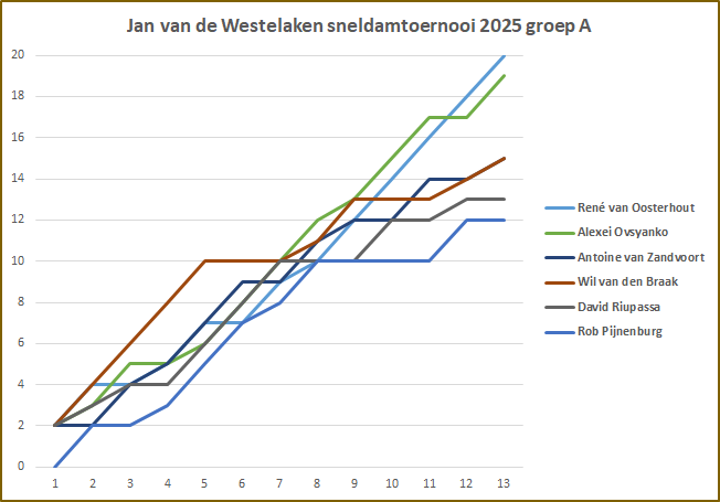 René van Oosterhout wint Jan van de Westelaken sneldamtoernooi! Na de voorronden met Zwitsers rating volgden vijf ronden in drie groepen.