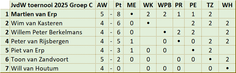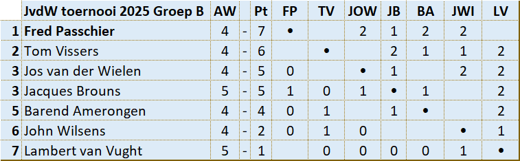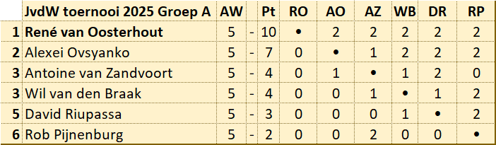 In groep A speelden 6 deelnemers een enkele competitie.