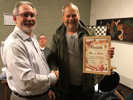 Wim ontving uit handen van onze voorzitter de oorkonde voor een ruim veertigjarig lidmaatschap van D'Amateurs. In zijn toespraak memoreerde voorzitter Peter nog aan de vervulling van de secretariaatsfunctie waar Wim in juni 2016 mee is gestopt. |