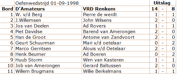 De slotpartij, waarin John op een magistrale wijze een moeizame remise behaalde, bracht voor D'Amateurs een nieuwe ervaring. Voor het eerst werd in een uitwedstrijd tegen V.R.D. niet verloren. Zelfs was er sprake van de eerste overwinning sinds 1998! |